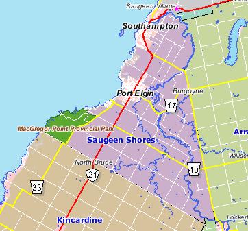 Pop. 2,994. In Saugeen T., Bruce C., on L. Huron at the mouth of the Saugeen R. and Hwy 21 and C. Rd. 13,38 km SW of Owen Sound. |