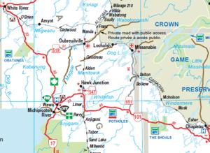Pop. 237. In the geographic Ts. of Lendrum and Rabazo, Algoma Dist., 6 km SW of Wawa at the mouth of the Magpie R. and L. Superior. The name is Ojibwa for 'great bluff.' |